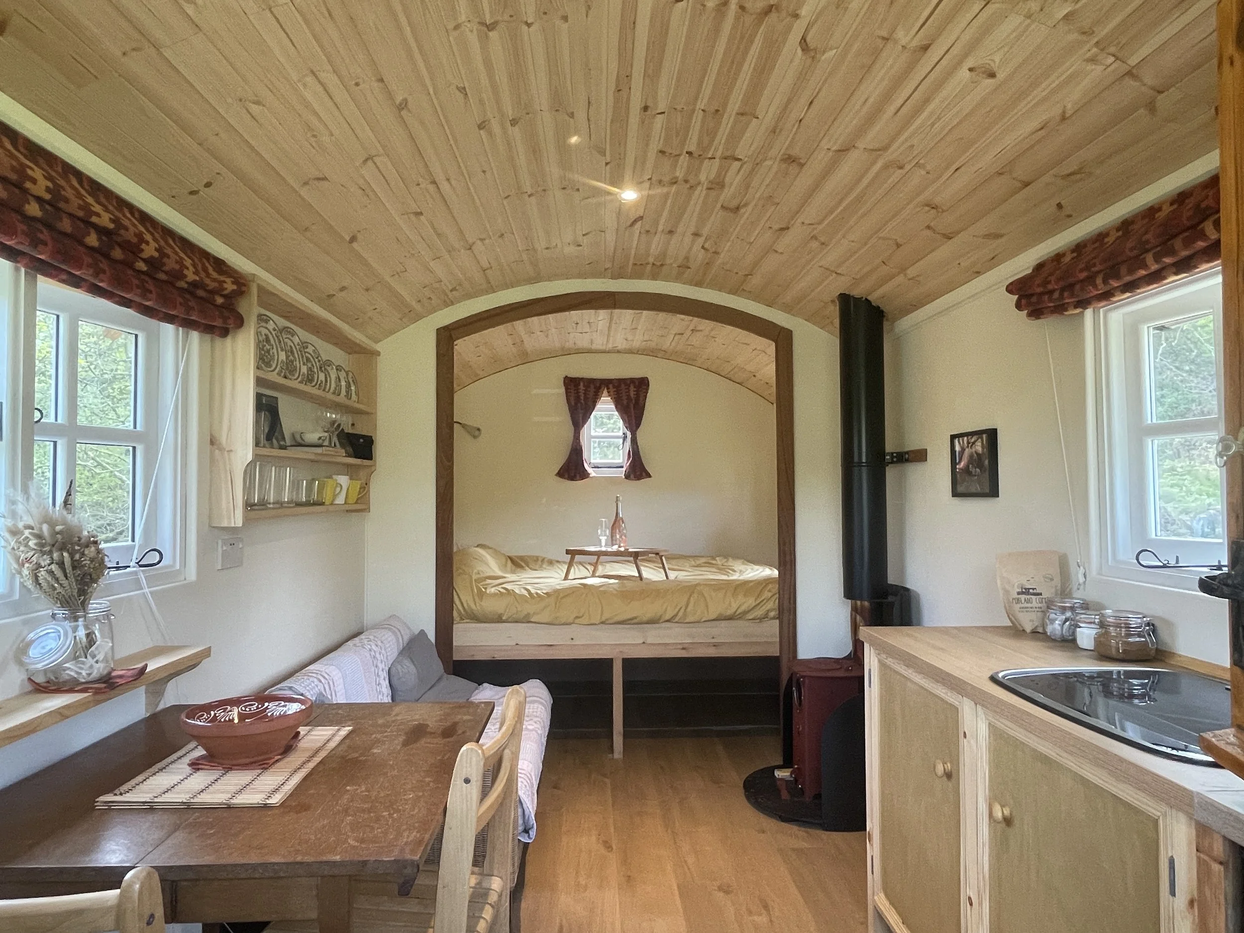 A cosy, homebuilt cabin for two with a woodburning stove, fully equipped kitchen and riverside location awaits